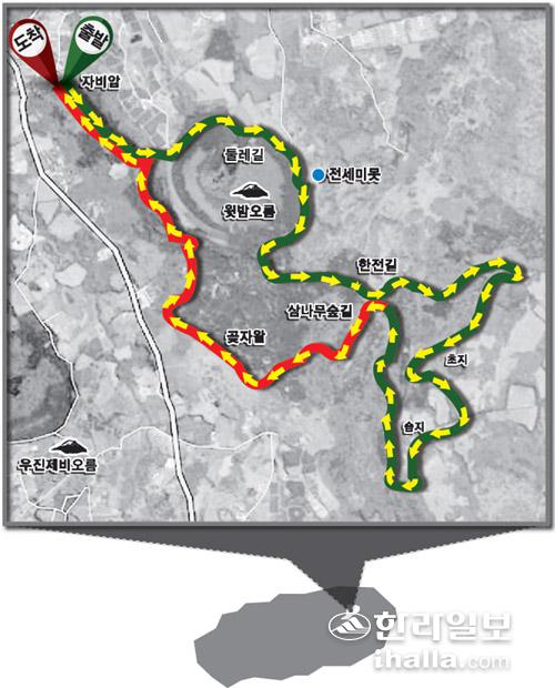 지난 24일 진행된 한라일보의 '2021년 제4차 제주섬 글로벌 에코투어'는 제주시 조천읍 선흘리 자비암 입구에서 시작해 삼나무숲길, 웃바메기오름, 한전길, 목장길, 용암길을 지나 목장길과 삼나무숲길, 자비암으로 돌아오는 코스에서 진행됐다. 이번 투어 역시 코로나19 사회적 거리두기의 영향으로 비대면으로 최소한의 인원만 참석한 가운데 진행됐다.