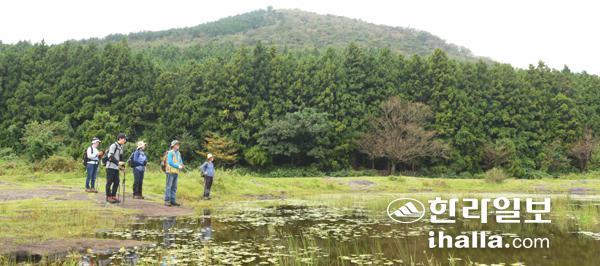 자연 샘인 '전세미'의 모습을 바라보는 에코투어 일행들의 모습. 배경으로 펼쳐진 웃바메기오름과 어울려 아름다운 풍경을 이루고 있다. 이상국기자