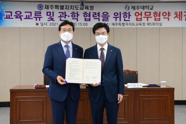 이석문 제주도교육감과 송석언 제주대 총장은 28일 도교육청 제5회의실에서 교육교류 및 관·학 협력을 위한 업무협약을 체결했다. 사진=제주도교육청 제공