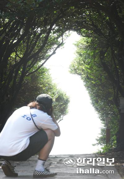 29일 서귀포시 남원큰엉해안경승지를 찾은 한 관광객이 나무들이 만들어 낸 한반도 모습을 카메라에 담고 있다. 이상국기자