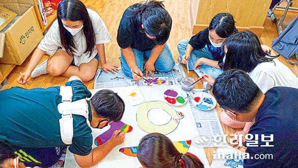 신제주초등학교(교장 김혜자)는 최근 5·6학년 360여명의 학생들이 7~9월 두 달여간에 걸쳐 제주 문자도를 모티브로 해 민화 작품(협동화)을 제작했다. 이날 우리 주변에서 흔히 볼 수 있는 돌하르방, 귤, 돌담, 바다, 한라산 등을 떠올려 그림으로 협동화를 제작했다.