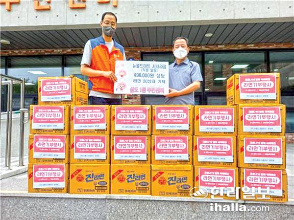 뉴월드마트 서사라점(대표 문정옥)은 지난 28일 제주시 삼도1동 관내에 거주하는 저소득 가정을 위해 라면 20상자(50만원 상당)를 기탁했다.