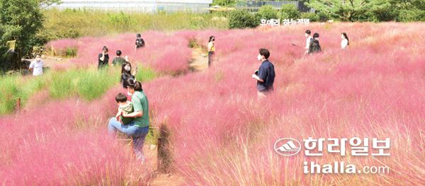 29일 서귀포시 휴애리자연생활공원을 찾은 관광객들이 아름답게 피어있는 핑크뮬리를 배경으로 기념사진을 찍고 있다. 이상국기자