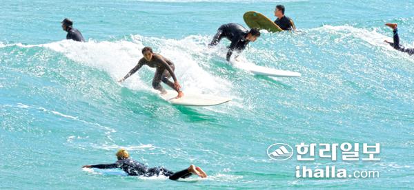 29일 제주시 구좌읍 월정리해수욕장에서 서퍼들이 파도를 타고 있다. 이상국기자