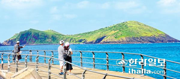 30일 제주시 한경면 바닷가를 찾은 관광객들이 선명하게 보이는 차귀도를 구경하며 제주에서의 추억을 만들고 있다. 이상국기자