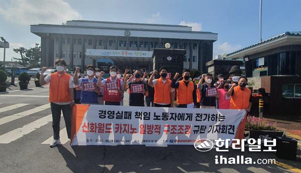 제주관광서비스노조 LEK지부가 1일 제주도청 앞에서 기자회견을 열고 일방적 구조조정을 반대하는 구호를 외치고 있다. 사진=강민성기자