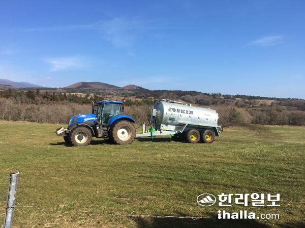 초지에 액비를 살포하는 모습.