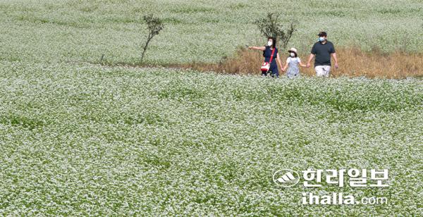 3일 서귀포시 성산읍 수산리 제주자연생태공원에 순백의 메밀꽃이 만개해 오가는 이들의 시선을 사로 잡는다. 소금을 뿌린듯 흐드러지게 피어난 메밀꽃 따라 시나브로 가을이 깊어간다. 강희만기자