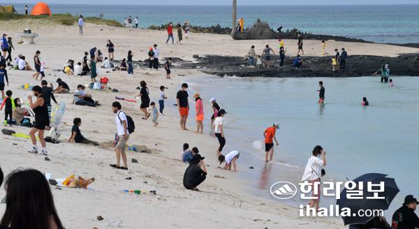 때아닌 늦가을 무더위가 찾아온 4일 제주시 한림읍 협재해수욕장에는 많은 도민·관광객들이 찾아 물놀이를 즐기고 있다. 강희만기자