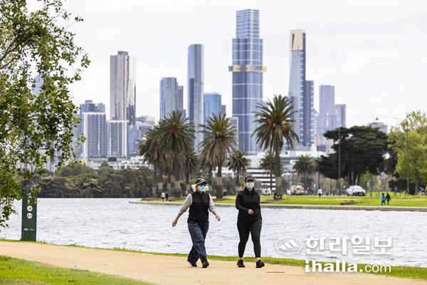 호주 멜버른의 시민들이 4일(현지시간) 앨버트 파크 호수 주변에서 산책하고 있다. 멜버른은 세계에서 가장 오래 신종 코로나바이러스 감염증(코로나19) 봉쇄 조치를 유지하고 있는 도시가 됐다. 종전 기록은 아르헨티나 수도 부에노스아이레스의 245일이었다.