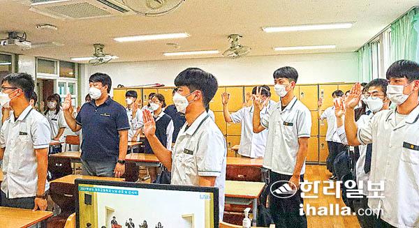 제주고등학교(교장 고용철)는 최근 제주고 학생들의 '비흡연을 위한 선포 및 선서식'을 랜선으로 개최했다. 학생자치회가 중심이 돼 진행된 이번 노담(NO담배) 선서식은 전교생이 각 교실에서 동참하는 형식으로 이뤄졌다.