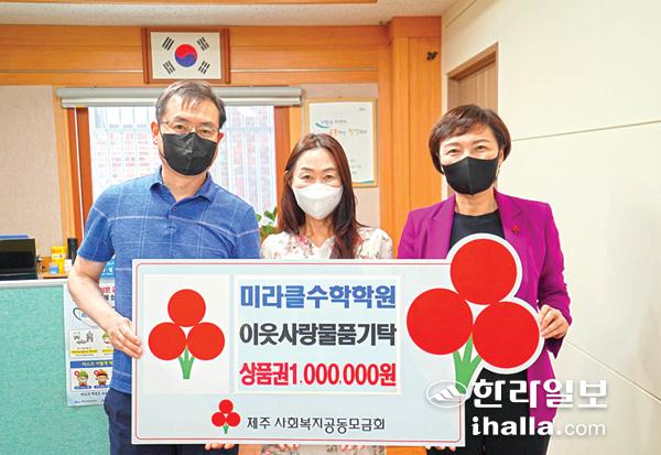 미라클수학학원(원장 오미라)은 지난 5일 제주시 연동주민센터에서 관내 어려운 이웃을 위해 사용해달라며 100만원 상당의 상품권을 제주사회복지공동모금회(회장 김남식)에 기탁했다.