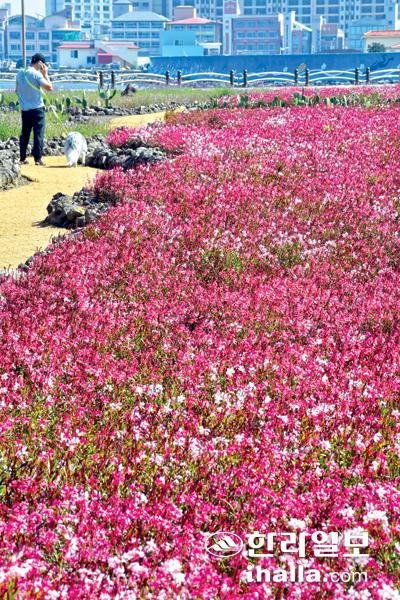 6일 제주시 이호동 한 공한지에 조성된 꽃밭에 분홍바늘꽃이 만개해 행인들의 눈길을 끌고 있다. 강희만기자