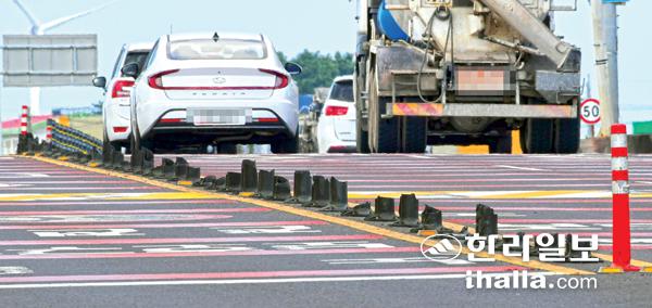6일 제주시 구좌읍 세화리 진입로 일부 구간에 설치된 중앙분리대가 파손된채 장기간 방치돼 있다. 강희만기자