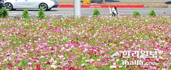 7일 제주시 노형동 우편집중국 인근에 코스모스가 활짝 펴 지나는 이들의 시선을 끌고 있다. 이상국기자