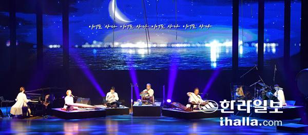 10일 제주아트센터에서 열린 특별 공연에서 김덕수와 앙상블 시나위가 '제주도의 신명' 주제 공연을 펼치고 있다. 이 공연은 지난 6일 취소된 개막 프로그램을 재구성해 준비됐다. 강희만기자