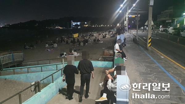 9일 새벽 1시 이호해수욕장에 노상객들의 발길이 이어졌다.