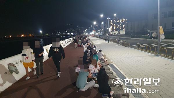 9일 0시 탑동광장에 노상객들이 자리를 잡고 취식하고 있다.