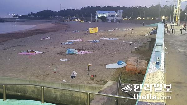 노상객들이 밤 사이 술판을 벌인 뒤 쓰레기를 그대로 놔두고 가면서 백사장인지 쓰레기장인지 구분하기 어려웠다.