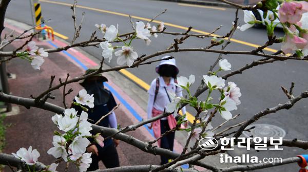 며칠 더위가 이어지더니 10일 제주시 도두동 마을 진입로의 벚나무에 벚꽃이 활짝 폈다. 제주지역엔 12일 비가 내린 후 본격적인 가을날씨가 이어질 것으로 전망된다. 강희만기자