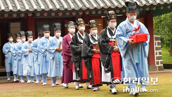 10일 제주시 삼성혈에서 탐라(耽羅)국을 세운 고·양·부 삼을나(三乙那)의 위업을 기리고 조상의 덕을 추모하는 삼성사 추기대제가 초헌관 고재규, 아헌관 양건홍, 종헌관 부창순 제관으로 봉행됐다. 강희만기자