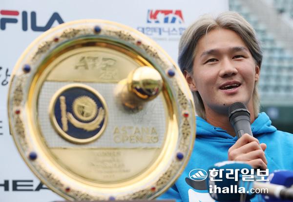 지난달 카자흐스탄에서 열린 남자프로테니스(ATP) 투어 아스타나오픈에서 우승한 권순우가 12일 서울 송파구 올림픽공원 테니스코트에서 기자간담회를 하고 있다.