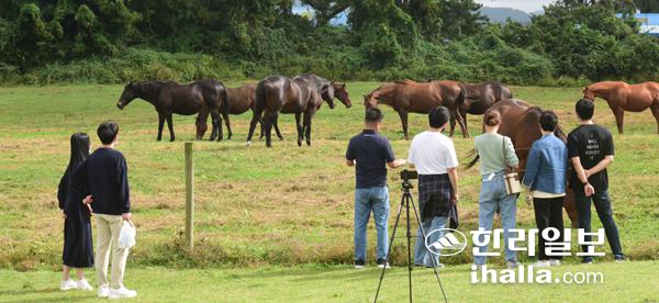 14일 제주시 한림읍 성이시돌목장을 찾은 관광객들이 말을 구경하며 즐거운 시간을 보내고 있다. 이상국기자
