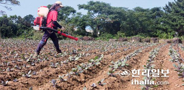 14일 제주시 한림읍 한 적채 밭에서 농민이 제초제 살포 작업으로 분주한 시간을 보내고 있다. 이상국기자