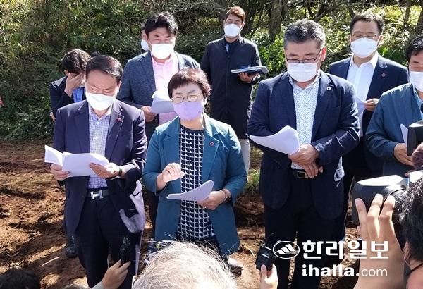 제주특별자치도의회 환경도시위원회가 15일 불법 건축 허가 논란이 일고 있는 국토교툥부의 제주남부 항공 레이더 건설 예정지인 서귀포시 색달동 1100고지 인근 삼형제큰오름을 방문해 공사 중지를 요청했다. 이상민 기자.