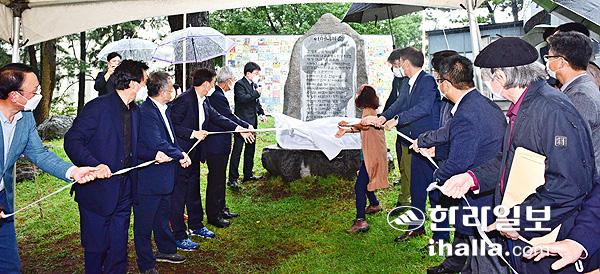 16일 서귀포기적의도서관에서 이뤄진 김재윤 시인 시비 제막식에는 비가 내린 궂은 날씨에도 유족, 현직 국회의원과 도육감, 도의원, 작가 등이 대거 참석해 작고한 고인의 뜻을 기렸다. 이상국기자