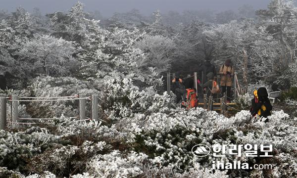 때이른 10월 한파가 몰아친 17일 한라산 영실 탐방로 윗세오름에 올해 첫 상고대가 피어 탐방객들의 시선을 사로잡고 있다. 강희만기자