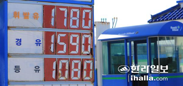 17일 오후 제주시의 한 주유소 입구에 휘발유 ℓ당 1천780원, 경유 ℓ당 1천590원을 알리는 가격안내판이 서 있다. 연합뉴스