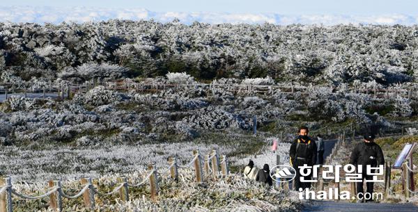 때이른 10월 한파가 몰아친 17일 한라산 영실 탐방로 윗세오름에 올해 첫 상고대가 피어 탐방객들의 시선을 사로잡고 있다. 제주지역은 19일 포근해졌다가 20일부터 다시 추위가 이어질 것으로 예보됐다. 강희만기자