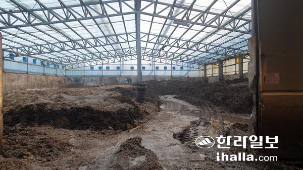 최근 제주시 봉개동 음식물자원화시설 내 창고에 쌓인 탈수케잌들.