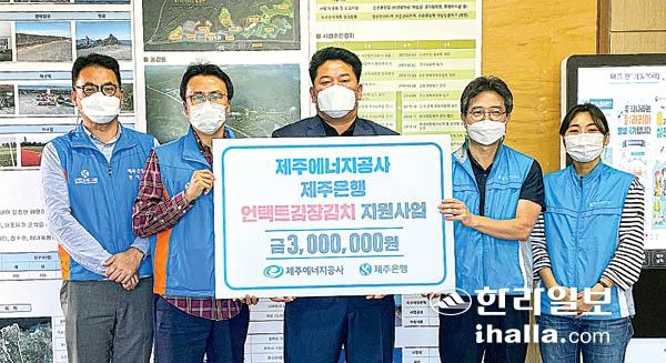 제주에너지공사(사장 황우현)와 제주은행(은행장 서현주) 봉사단은 지난 15일 주민이 참여하는 사회공헌사업의 일환으로 구좌읍 동복리사무소에서 김장김치 2001㎏을 저소득 어르신 35가구에 기부했다.