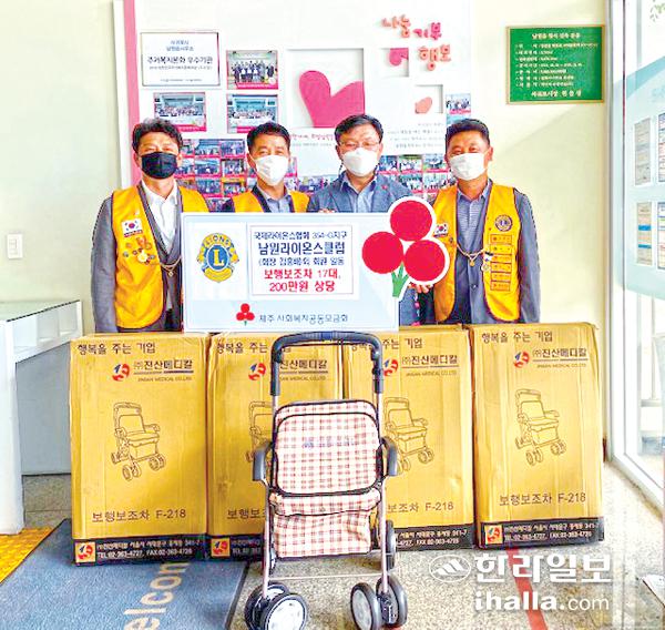 국제라이온스협회 354-G지구 제주남원라이온스클럽(회장 김홍배)은 지난 15일 보행보조차 17대(200만원 상당)를 지역 내 거동이 불편한 고령의 노인들에게 전해달라며 서귀포시 남원읍에 기탁했다. 김홍배 회장은 "걸음이 불편하고 보행보조차 구입이 어려운 어르신에게 도움이 됐으면 한다"고 전했다.