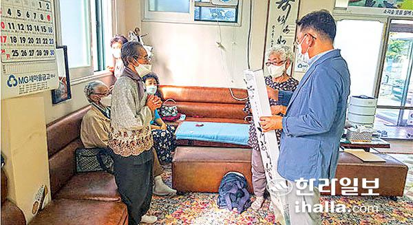 제주시 오라동은 제25회 노인의 날을 맞아 지난 14일 지역내 경로당을 방문해 100세 장수어르신에 장수지팡이'청려장'과 대통령 축하 서한을 전달하고 안부를 묻는 등 위문활동을 전개했다.