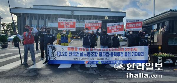 민주노총 건설노조가 19일 제주도청 앞에서 기자회견을 열고 구호를 외치고 있다. 사진=강민성기자