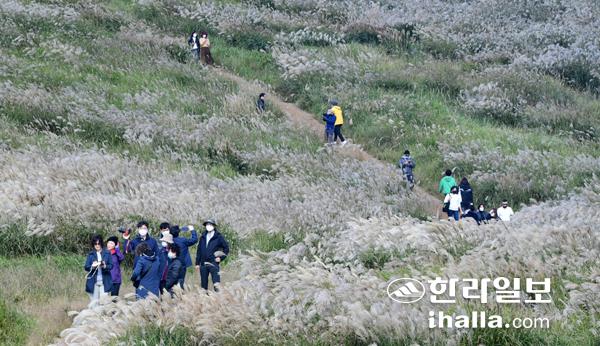 19일 제주시 애월읍 봉성리 새별오름 억새꽃 탐방로에 억새꽃이 활짝 피어나 제주 가을의 정취를 알려주고 있다. 강희만기자