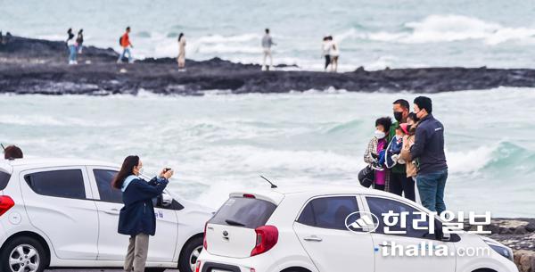 20일 제주시 한림읍 협재해수욕장을 찾은 관광객들이 거친 파도를 배경으로 기념사진을 찍고있다. 이상국기자