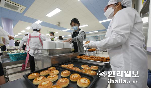 급식실 노동자들이 파업하면서 급식이 빵 등으로 대체된 가운데 20일 탐라중학교에서 급식 준비가 이뤄지고 있다. 이상국기자