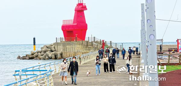 쌀쌀한 날씨를 보인 20일 제주시 이호테우해수욕장을 찾은 관광객들이 말등대 구경을 하며 즐거운 시간을 보내고 있다. 이상국기자
