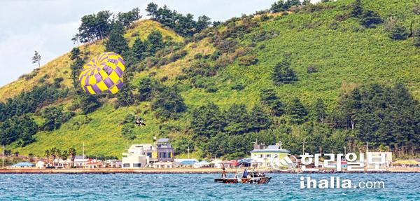 21일 제주시 협재해수욕장을 찾은 관광객들이 시원한 바람을 맞으며 패러세일링을 즐기고 있다. 이상국기자