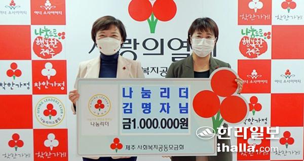이번 성금은 김명자씨가 어려운 이웃들을 위해 마련한 것으로, 제주도사회복지협의회를 통해 지역사회 복지사각지대 해소에 사용될 예정이다. 한편 김명자씨는 지난 2017년 8월 제주 나눔리더 47호로 가입했다.