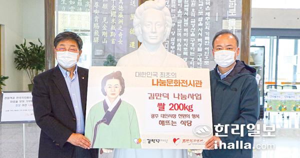 김만덕기념관(관장 김상훈)은 최근 광주광역시 대인시장에서 고 김선자씨의 유지를 이어 딸 김윤경씨가 운영 중인 ‘천원의 행복’ 백반집인 ‘해뜨는 식당’에 김만덕 사랑의 쌀 200kg을 지원했다.