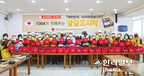 대한적십자사제주특별자치도지사(회장 오홍식)는 지난 21일 적십자사 나눔터에서 홍보대사 가수 이정, 프로골퍼 장정·이준식 부부, 봉사원 등 30여 명이 참여한 가운데 ‘1004가 전해주는 황금도시락’ 사업을 실시했다.