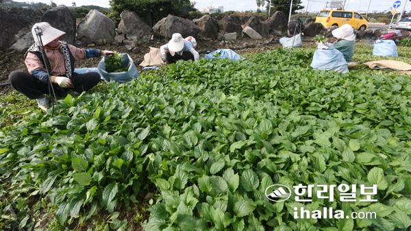 23일 제주시 애월읍 한 밭에서 농민들이 취나물 수확 작업으로 분주한 시간을 보내고 있다. 이상국기자