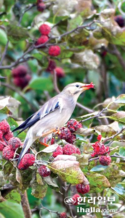 24일 제주시 한경면 용수리 들녘에 붉은부리찌르레기가 잘 익은 꾸지뽕열매로 포식을 하고 있다. 강희만기자
