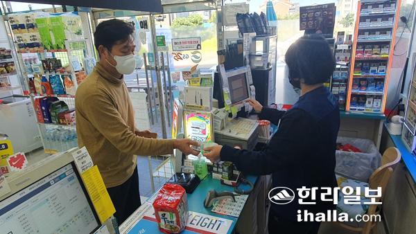25일 오전 제주도내 모 편의점에서 현금거래를 통해 물건을 사고 있다. 이날 오전 11시20분부터 12시까지 약 40분 가량 전국 KT 유무선 인터넷 서비스가 먹통이 되며 음식점이나 마트, 카페 등에서 카드 결제가 불가능해지는 사태가 발생했다. 강민성기자