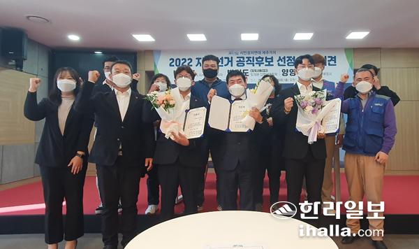 시민정치연대 제주가치가 25일 제주도의회 1층 도민카페에서 기자회견을 열고 내년에 치러지는 제8회 전국동시지방선거 도지사 후보에 박찬식 전 제2공항강행저지비상도민회의 상황실장(사진 중앙), 도의회 후보에 박건도 제주주민자치위원회 참여자치위원장(사진 오른쪽 두번째), 양영수 민주노총 제주본부 부본부장(사진 왼쪽 3번째)을 선정했다고 밝혔다. 사진은 힘차게 화이팅하는 제주가치 도지사·도의회 입후보 예정자들.